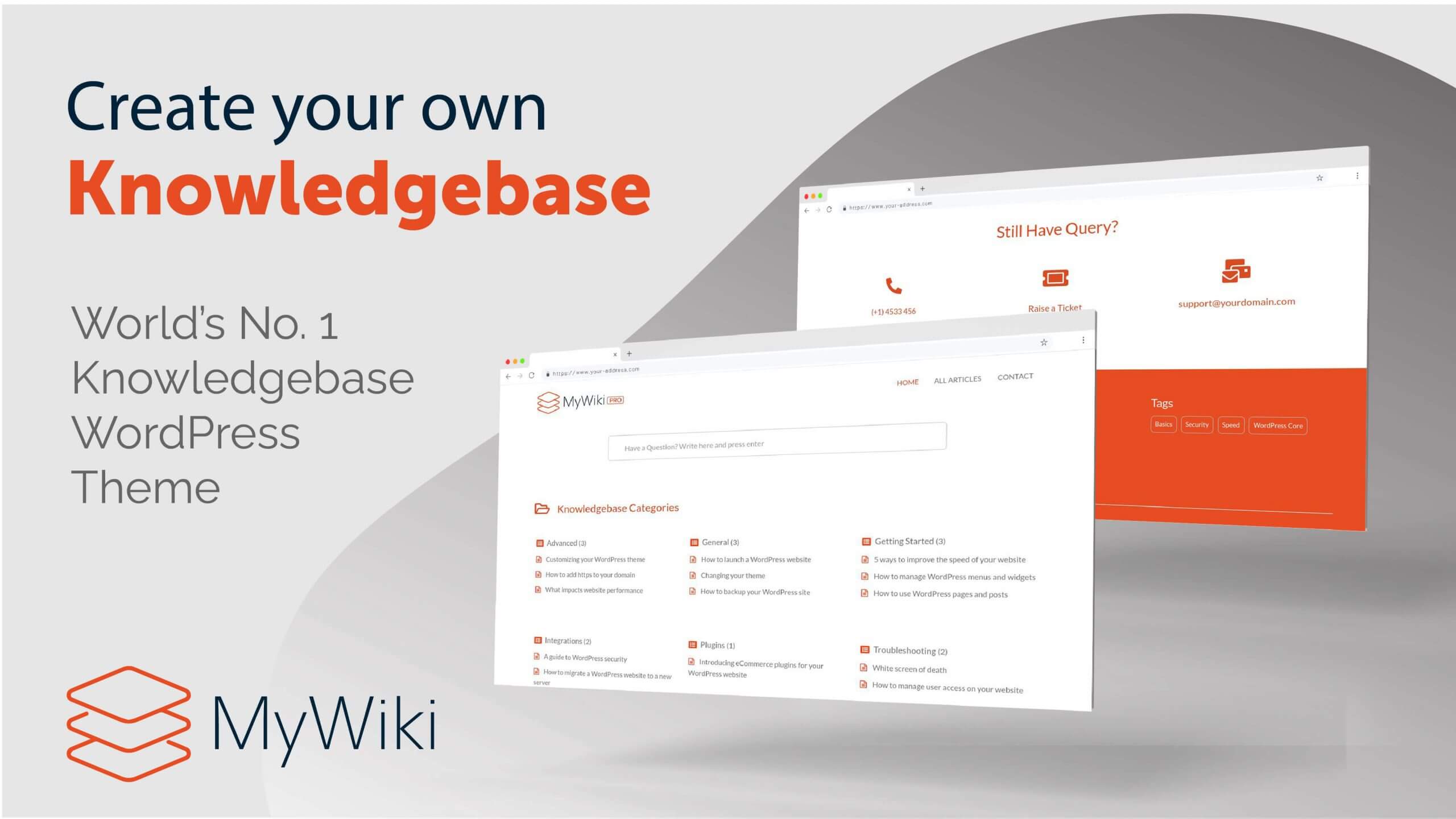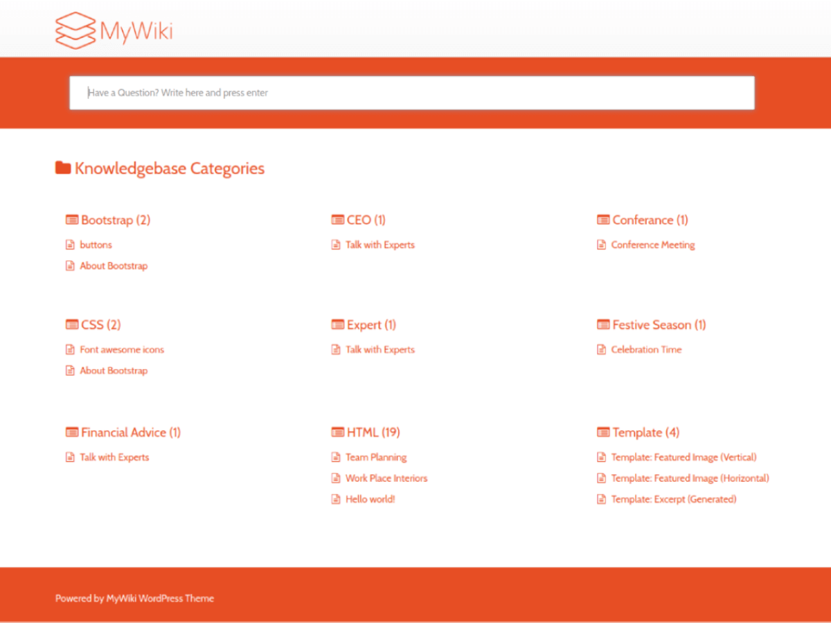 MyWiki is a simple, lightweight and fast loading WordPress Theme for individuals and companies to manage their Knowledge-base or Support or Wiki or Frequently Asked Questions (FAQs) through a WordPress website.