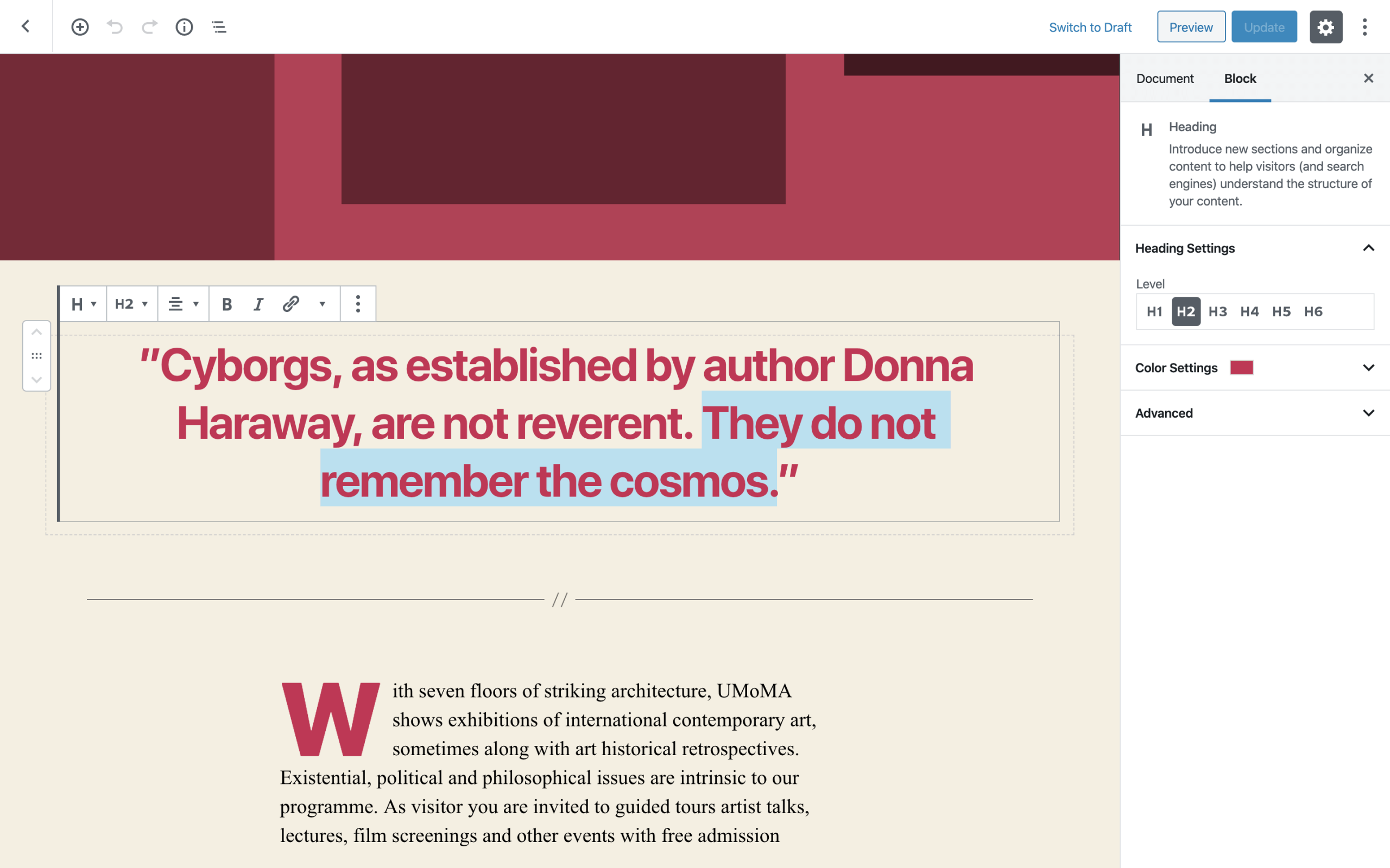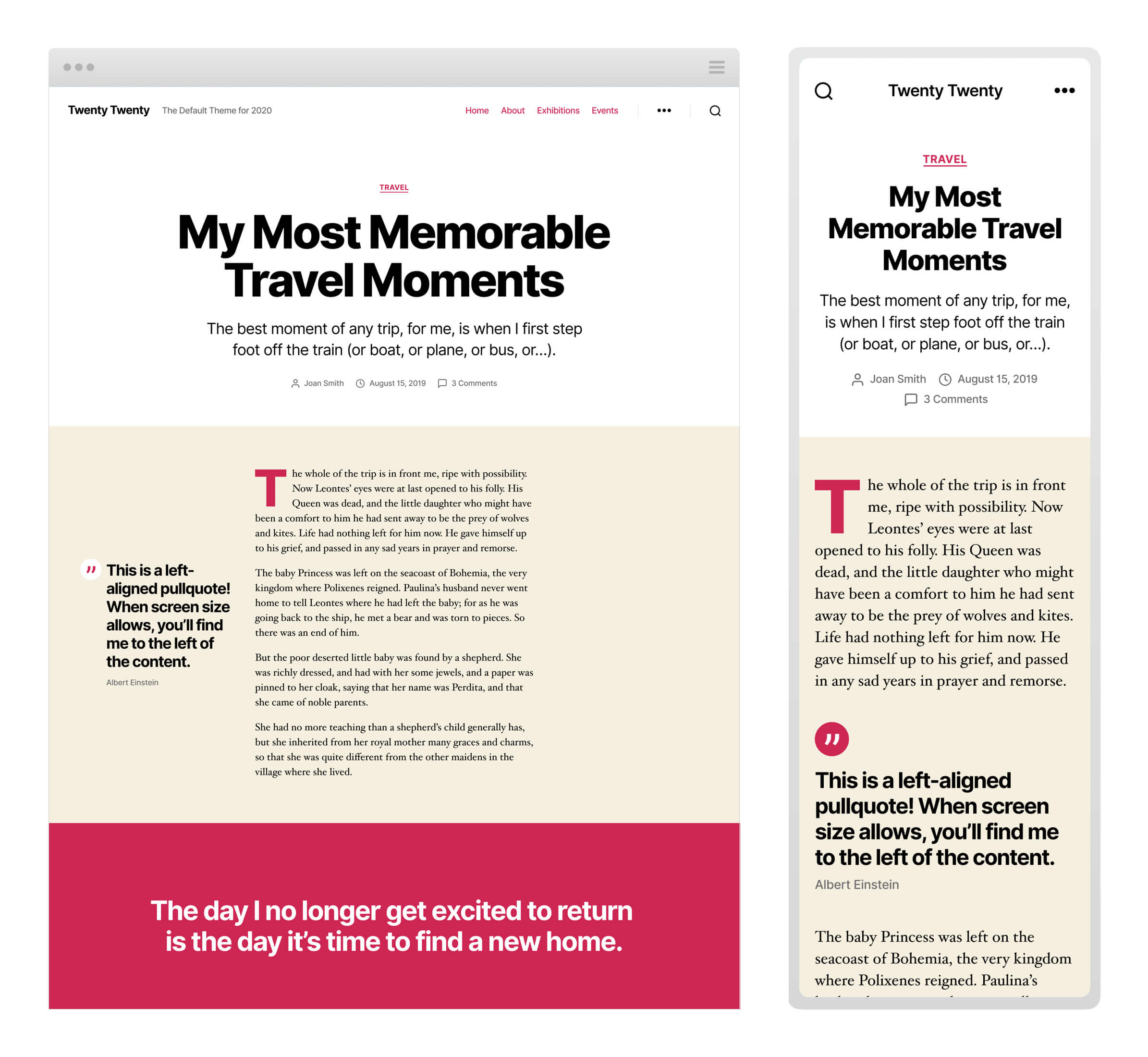 Twenty Twenty theme for 2020 is designed to take full advantage of the flexibility of the block editor. Organizations and businesses have the ability to create dynamic landing pages with endless layouts using the group and column blocks. The centered content column and fine-tuned typography also makes it perfect for traditional blogs. Complete editor styles give you a good idea of what your content will look like, even before you publish. You can give your site a personal touch by changing the background colors and the accent color in the Customizer. The colors of all elements on your site are automatically calculated based on the colors you pick, ensuring a high, accessible color contrast for your visitors